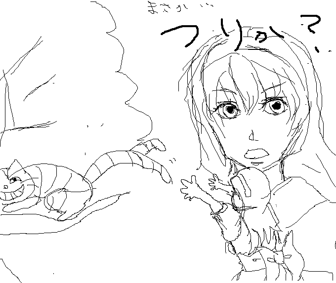 最初は女の子とチェシャ猫だけだったんですけど、なんかさびしかったので、「まさか・・・釣りか!?」と疑っている女の子のえを入れたら、なんかすごくこわいことになりました。